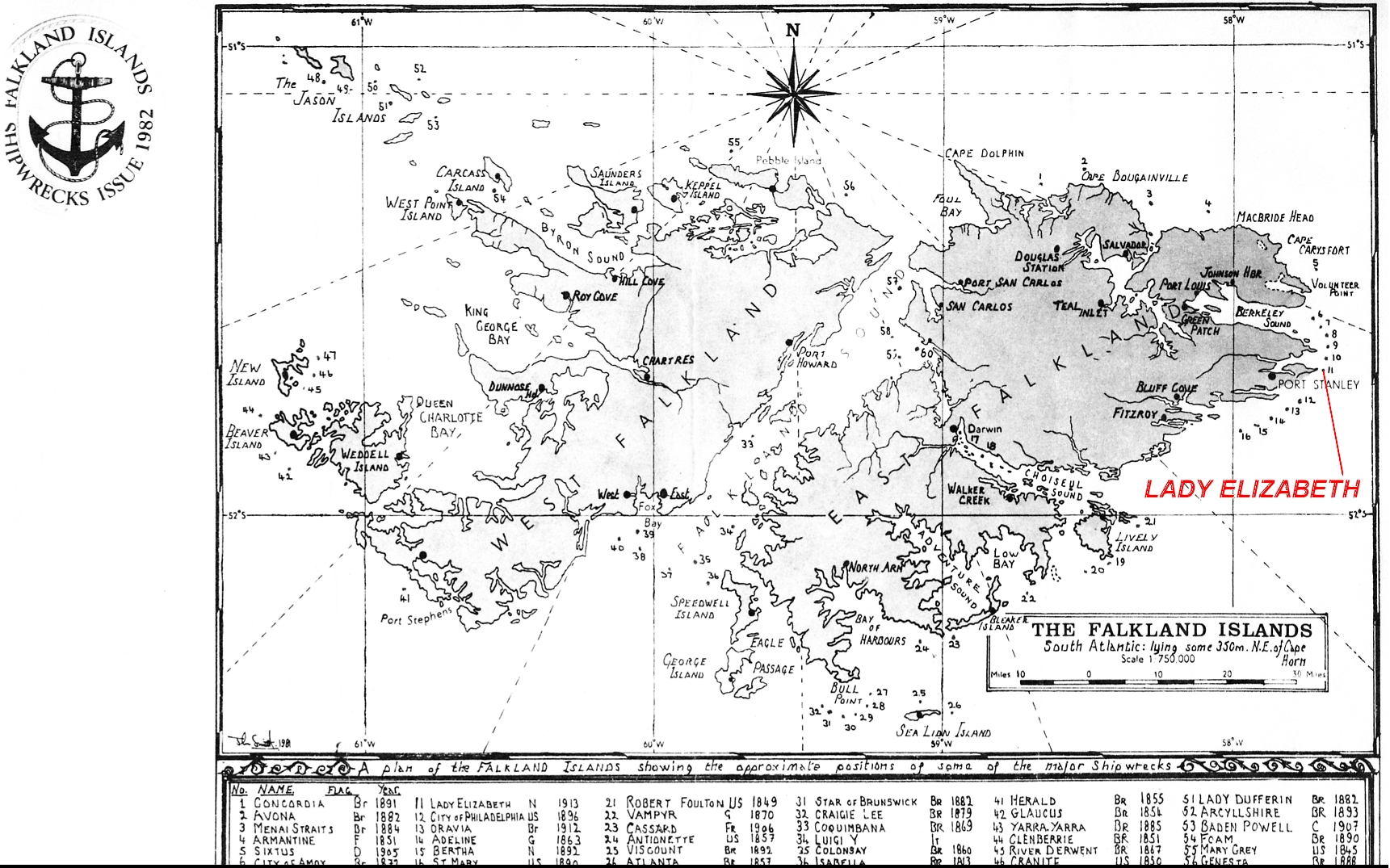 Map of Falkland Islands showing the location of the Lady Elizabeth