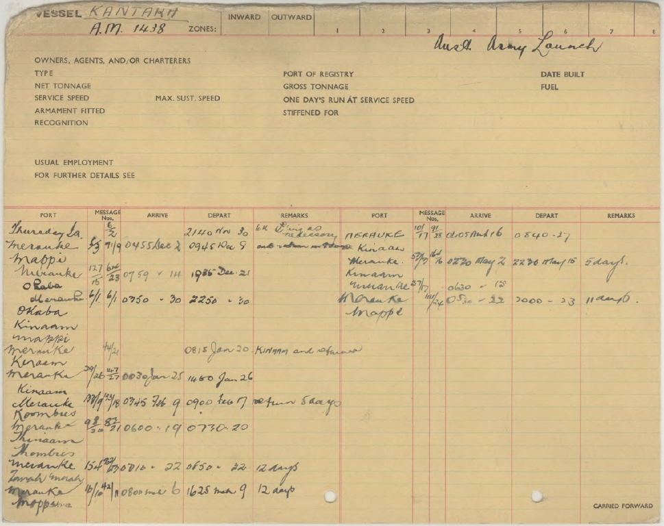 Wartime deployment The original purpose of the 40’ Workboats was to support the Allied operations in the islands to the North of Australia. Most of the Army launches saw service in locations from Torres Strait to New Guinea and perhaps also in the Solomon Islands. A few were apparently stationed at training establishments on the Australian coast. There is a lot more research that needs to be done on this period. A number of the boats are recorded on these Royal Australian Navy Record of Shipping Movements compiled during WW2. This is a rich resource yet to be examined. One of the record cards is shown here, this one being for the 40’ Army Workboat AM1438 Kantara. Believed to start in 1942, it indicates she was at Thursday Island, Merauke, Mapi, Okaba, Kinaam and Koombus between November and the following May. These are locations inside what was then Dutch New Guinea on the Southern coast of the island West of the border with Papua. There was a major Allied air base located at Merauke, and it was the site of fighting between Japanese and Australian patrols.