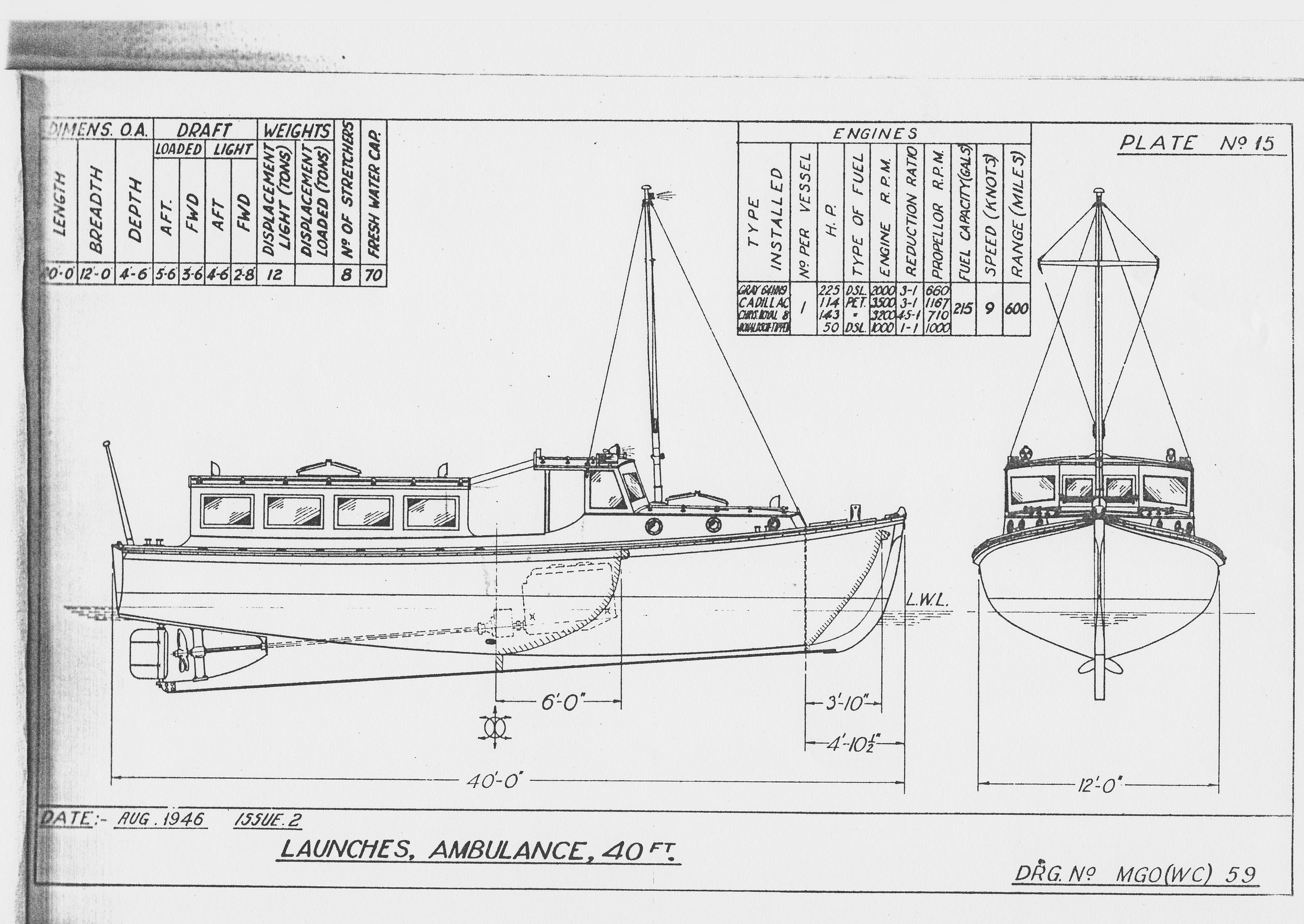 Most were built for the Australian Army with 323 identified. Some sources say up to 336 were built for the Army. The additional 13 have yet to be ascertained. The Army boats were designated by AM standing for “Army Motor”. The first batch of 8 prototypes designated AM1435 to AM1442 appear to have been built in late 1942 or early 1943 by J. Botterill and Fraser. They are recorded as being in service prior to the big contracts being announced in September 1943. One can surmise that J. Botterill & Fraser built the first batch relatively traditionally with the other contractors looking on to learn the craft and see how it might be adapted to mass production. At least one of these boats was designated experimental and may well have been used for trials to prove the design before mass production and perhaps for subsequent trials of engines and configurations. Indications are that the prototype design was subsequently modified in the light of experience. The cockpit deck on the prototypes went right up to the front of the wheelhouse. The helmsman stood on a raised platform, but headroom under the wheelhouse roof was rather limited. Both Mark 1 and Mark 2 designs had the cockpit deck raised in way of the wheelhouse, and the wheelhouse itself was taller. All but two of the Army launches were also given names. For example, in 1945 AH1567 had the name Hatta and AM1643 had the name Latrun. Four of the workboats have so far been identified as having served with the RAAF. These were designated 017-29, 017-30, 017-32, 017-33. There were other launches with the 017 prefix, but many of these were not the same. Though the workboats are perhaps best known for their long careers with the Royal Australian Navy, only 6 of the 40' workboats are recorded as having actually been built for the RAN; these being AWB404, AWB405, AWB407, AWB408, AWB409 and AWB411. The designation AWB stood for “Australian Work Boat”, and not “Army Work Boat” as is sometimes quoted. A real surprise is the 84 workboats that were built or were building for the Royal Navy. These would probably have been intended for RN operations in South East asia, though little is known. The Royal Navy launches were given a WB prefix probably standing for “Work Boat” followed by a 5 digit number commencing with 45. Based on the above numbers, this gives a total tally of at least 417 of the 40’ workboats. Variations on the Standard configuration - Sea Ambulance