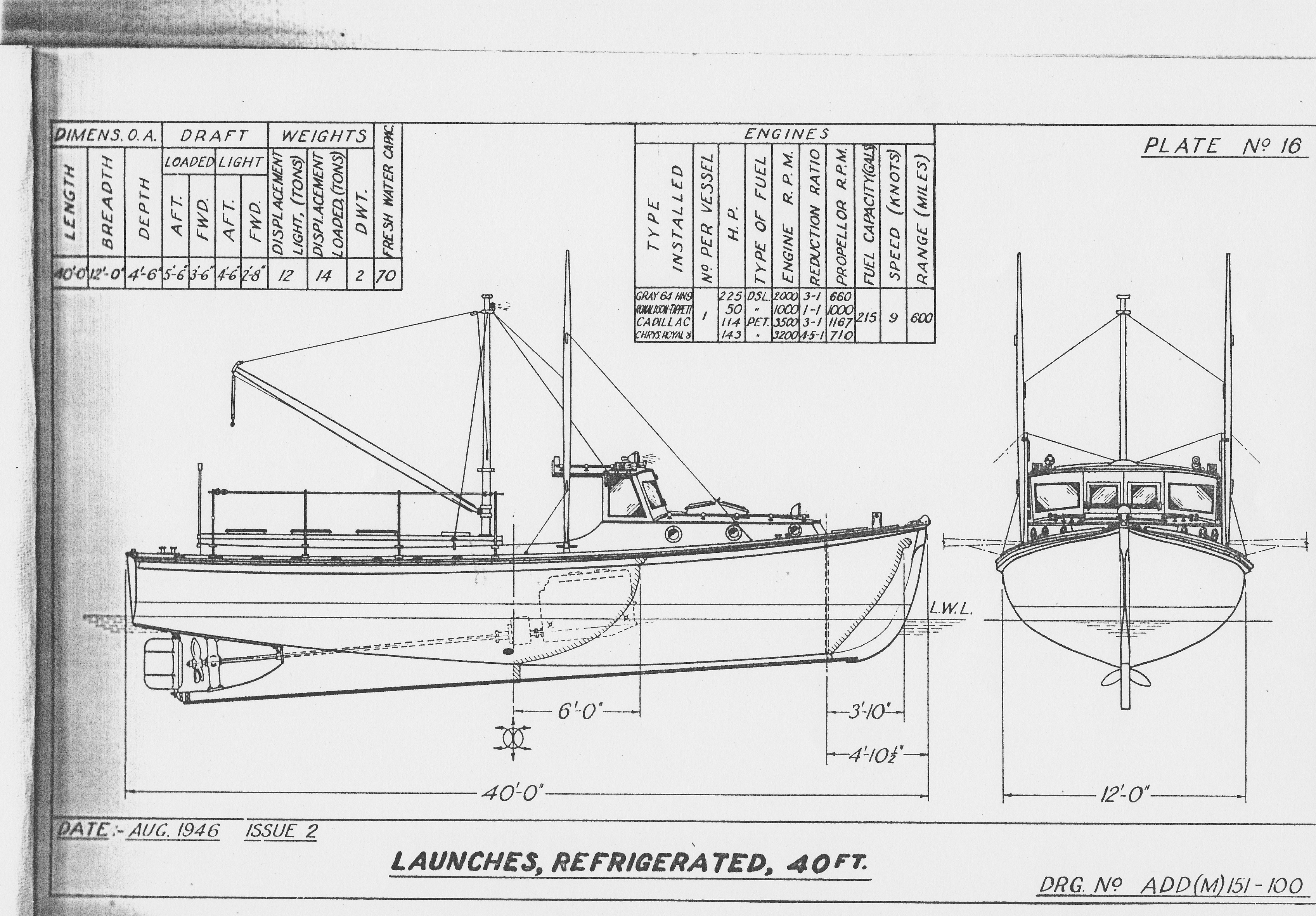 A drawing that illustrates the Refrigerated configuration can be downloaded from the link above. The boat is arranged with mast and derrick abaft the wheelhouse, the side booms either side of the wheelhouse and the refrigerated hold aft. Engines