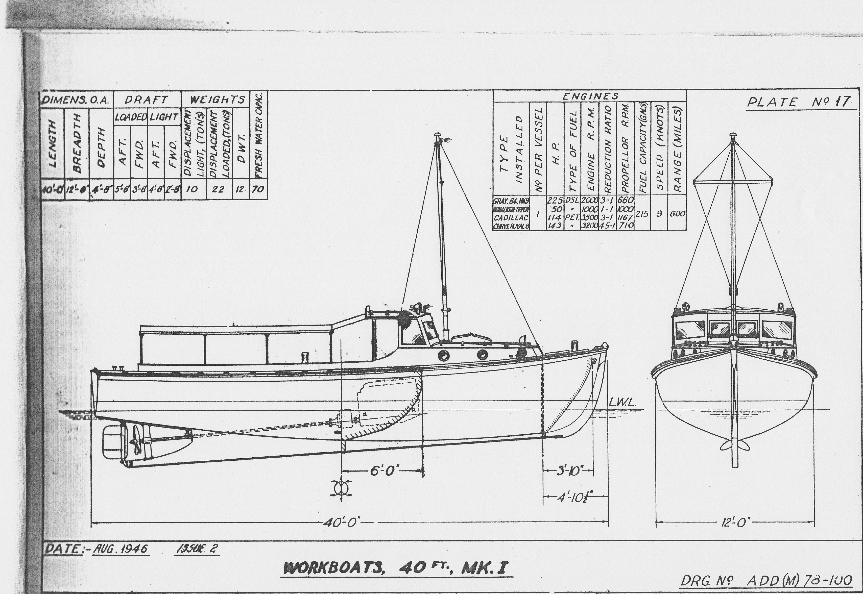 The 6 boats for the Royal Australian Navy were all completed in late 1944 and early 1945 by General Motors – Holdens and most appear to have been fitted with Graymarine diesels, probably part of the RAN's allocation. Most of the workboats built for the RAN were shipped to New Guinea. None are currently in service with the RAN. The last shown was AWB404 Topaz which was sold around 2011. In the latter half of 1945 General Motors - Holden's Ltd at Woodville, SA were engaged in building 30 of the 40' workboats for the Royal Navy. The workboats were to be fitted with Chrysler Royal engines. A progress report dated 20 August 1945 advised that component parts for the 30 workboats were nearing completion and would be finalised within 2 weeks. 18 keels had been laid and 14 hulls completed awaiting engines. By the end of October it was expected that the 30 keels would have been laid and 26 hulls built, with the balance in the final stages of construction. With no information as to the availability of Chrysler Royal engines, no indication could be given as to how many boats would be fitted with engines by the end of October. The end of WW2 came suddenly. A secret weapon, the atomic bomb, was dropped on Hiroshima on 6 August and another was dropped on Nagasaki on 9 August. Within a week Japan had surrendered. Without having prior knowledge of the atomic bomb and the tremendous change in tactical advantage they would bring, construction of small craft in Australia had proceeded unabated. By 25 October 1945 there were 33 of the 40’ Army workboats under construction: 3 for the RAN, 23 for the Royal Navy and 7 for the RAAF. A meeting recommended that construction be immediately terminated. It noted that the Army had 57 of the 40’ workboats unallocated and the RAN would be a potential purchaser. The RAN Workboats after WW2 Very soon after the end of the War, the Royal Australian Navy acquired about 38 additional launches that were surplus to the requirements of the Australian Army. These became AWB403, 406, 410 and AWB412 to 446. No references have been found so far for AWB401 and AWB402.