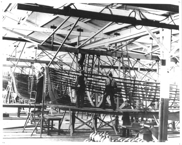 The name of the builder of each boat was cast into the rim of the steering wheel. As well as the wheel marked for General Motors - Holden's above, examples have been found of steering wheels for J. Botterill and Fraser and A.T.Brine Pty Ltd, So far, no steering wheels marked for the Ford Manufacturing Company have been located. Sadly, many workboats no longer have their original steering wheel. Only one contemporary builder's plate has been sighted (see photo above). Reminiscances of men that knew the boats could not recall seeing a builders plate. It is thought that perhaps builder's plates may have only been specified for the workboats provided to the Royal Navy (see below). The following is a wonderful series of photographs provided by Don Roberts which show the workboats under construction; some in the GMH’s Woodville Plant in Adelaide and some at their plant in Fisherman’s Bend. In this first photo, the keel has been laid. The stem, transom and transverse