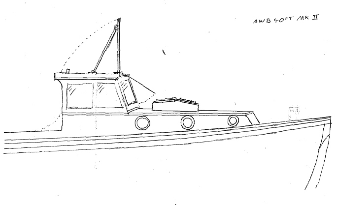 In standard form, the Army workboats were of cockpit configuration, decked in forward and with a coachhouse in front of a short wheelhouse. The cockpit aft was open except for a canvas shelter on light frames. The mast was 16’ tall and could be folded by means of a tabernacle at the height of the wheelhouse roof. When built, each launch carried an 8’ dinghy on the wheelhouse roof. They were originally designed to be fitted with a 165bhp GM 6-71 diesel engine supplied from the USA on lend lease. The specification called for keel, stem, stern post of jarrah, a transom of double skin oregon, ½” inner skin, ⅝” outer skin. The ribs were to be of two laminations of suitable steam bent timber each 1” x 2⅜” at about 7” centres. There were to be 21 oregon hull planks on each side finished to 1⅛”. The hull to be copper fastened and copper sheathed. The deck forward was to be ¾” 7-ply bondwood. Built to meet the needs of an emergency, longevity was probably not a high priority, though there are still many on the water after 70 years of service. Over time, there were small design changes in the WW2 Army workboats as built. A Mark II version was also produced, without the tall mast and with two windows on each side of the wheelhouse. They were probably not intended for the army, but for one of the other services. The three portlights per side of the coachhouse were a defining feature of both versions. David Glasson has identified some of these in sketches he made while compiling information to make his models. Late in 1942 the Australian Shipbuilding Board began letting contracts with various manufacturing firms to build small vessels for the services, even though some of these firms may have had no shipbuilding background. The wartime builders of the 40' Army workboats were