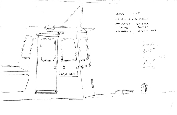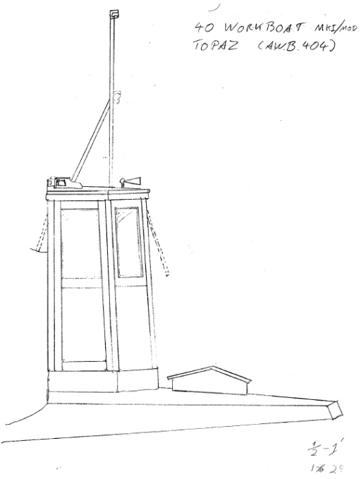 The motors were 'derated' by replacing the 'Services 90' injectors with 'Peacetime 60' injectors reducing the engine power from 225bhp to 165bhp. At some later time after WW2, the RAN acquired three more Army launches: AM1658, AM1783 and AM2009. For these, only the prefix was changed to AWB but the original Army numbers were retained. They became AWB1658, AWB1783 and AWB2009. Some of the 40' workboats operating with the RAN also carried the name of the base to which they were attached; AWB417 was given the name Harman for the Naval Radio Communications Centre in Canberra. AWB418 that was based at the Royal Australian Naval Air Station at Nowra between 1958-1963 carried the name Albatross during this time. The RAN workboats attached to the pound at Garden Island were not named. But the launches that served Spectacle Island depot in Sydney were named Garnet (444), Onyx (416), Topaz (404) and Amethyst (420). In the 1960s and 1970s a number of the RAN workboats were remodelled with a raised wheelhouse and aft coachouse, providing better shelter for use as personnel carriers. These sketches by David Glasson show modifications that were made to AWB404 and AWB420.
